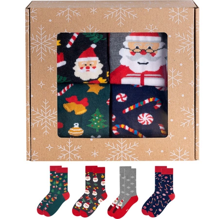 - Zestaw świątecznych skarpetek, zawierający 4 pary z różnymi wzorami o motywach świątecznych , wprowadzi radosny klimat Bożego Narodzenia do Twojej garderoby. Wykonane w Polsce z miękkiej, wysokiej jakości bawełny, zapewniają wygodę i ciepło na zimowe dni.