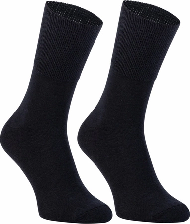 Skarpety bawełniane bezuciskowe granatowe. Wykonane z bawełny czesanej certyfikowanej najwyższej jakości z dodatkiem poliamidu i elastanu. Idealnie dopasowane do stopy. Ściągacz nie uciskający oraz płaski szef. Wyprodukowane w Polsce.
